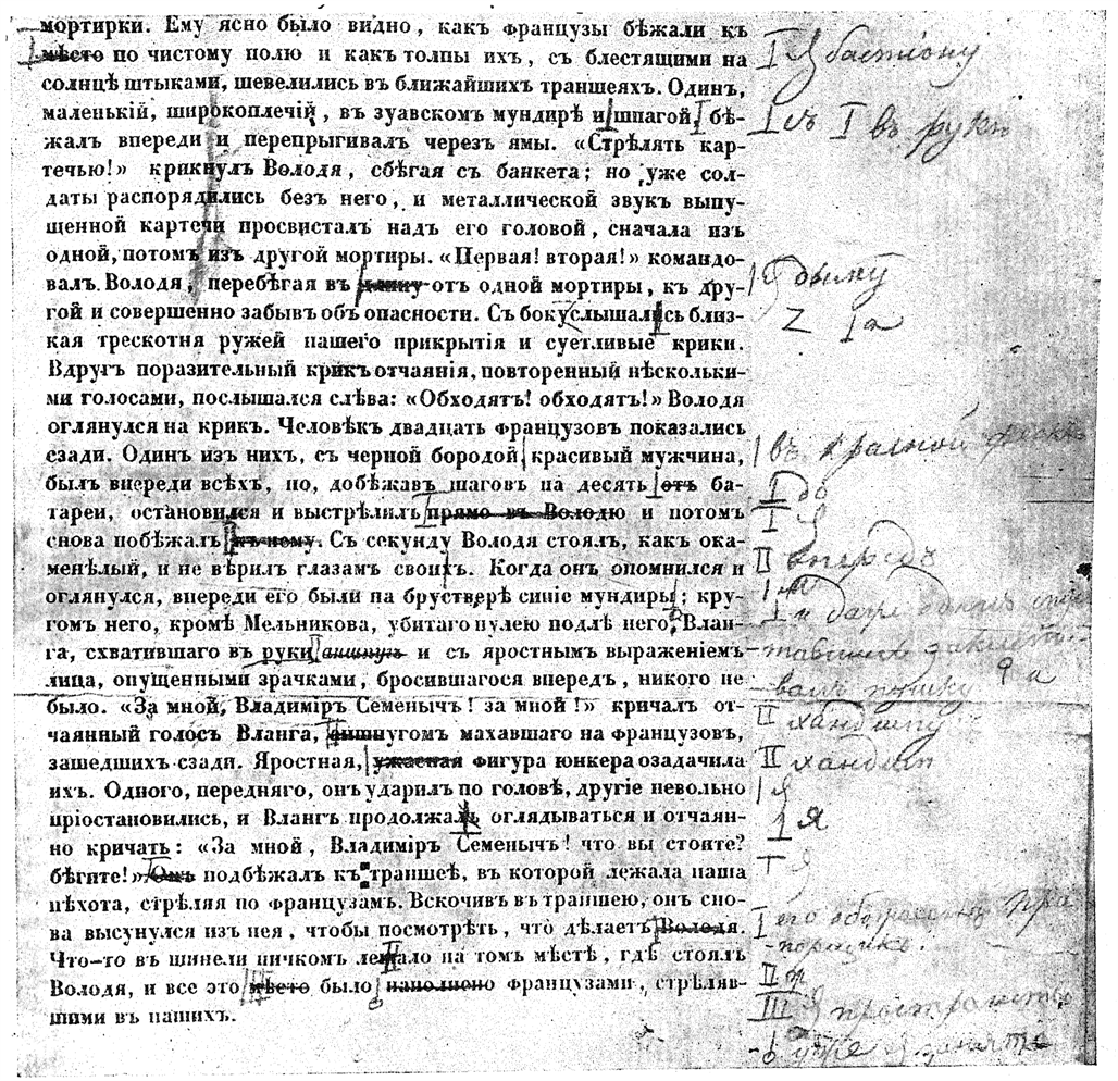 Вдруг поразительный крик отчаяния, повторенный несколькими голосами, послышался слева: «Обходят! Обходят!» Володя оглянулся на крик. Человек 20 французов показались сзади. Один из них, с черной бородой, в красной феске, красивый мужчина, был впереди всех, но, добежав шагов на 10 до батереи, остановился и выстрелил и потом снова побежал вперед. С секунду Володя стоял, как окаменелый и не верил глазам своим. Когда он опомнился и оглянулся, впереди его были на бруствере синие мундиры и даже один спустившись заклепывал пушку. Кругом него, кроме Мельникова, убитого пулею подле него, и Вланга, схватившего вдруг в руки хандшпуг и с яростным выражением лица и опущенными зрачками бросившегося вперед, никого не было. «За мной, Владимир Семеныч! за мной! Пропали!» кричал отчаянный голос Вланга, хандшпугом махавшего на французов, зашедших сзади. Яростная фигура юнкера озадачила их. Одного, переднего, он ударил по голове, другие невольно приостановились, и Вланг, продолжая оглядываться и отчаянно кричать: «За мной, Владимир Семеныч! что вы стоите! Бегите!» подбежал к траншее, в которой лежала наша пехота, стреляя по французам. Вскочивши в траншею, он снова высунулся из нее, чтобы посмотреть, что делает его обожаемый прапорщик. Что-то в шинели ничком лежало на том месте, где стоял Володя, и всё это пространство было уже занято французами, стрелявшими в наших.