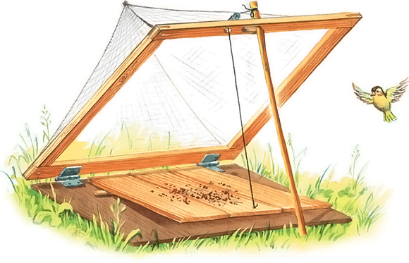 Достал Серёжа семя, насыпал на дощечку и выставил сетку в сад. И всё стоял, ждал, что птички прилетят. Но птицы его боялись и не летели на сетку. Пошёл Серёжа обедать и сетку оставил. Поглядел после обеда, сетка захлопнулась и под сеткой бьётся птичка. Серёжа обрадовался, поймал птичку и понёс домой.