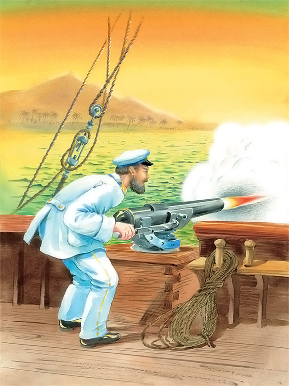 В это время капитан корабля, отец мальчика, вышел из каюты. Он нёс ружьё, чтобы стрелять чаек. Он увидал сына на мачте и тотчас же прицелился в сына и закричал: