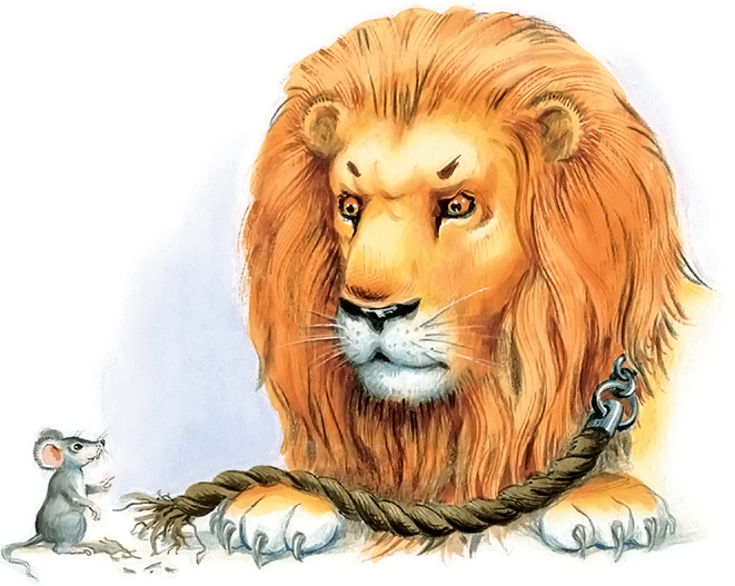 Потом охотники поймали льва и привязали верёвкой к дереву. Мышь услыхала львиный рёв, прибежала, перегрызла верёвку и сказала: