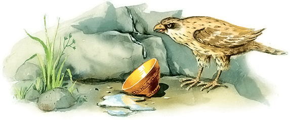 Когда в третий раз царь набрал полную чашу и стал подносить её к губам, сокол опять разлил её. Царь рассердился и, со всего размаха ударив сокола об камень, убил его. Тут подъехали царские слуги, и один из них побежал вверх к роднику, чтобы найти побольше воды и скорее набрать полную чашу. Только и слуга не принёс воды; он вернулся с пустой чашкой и сказал: