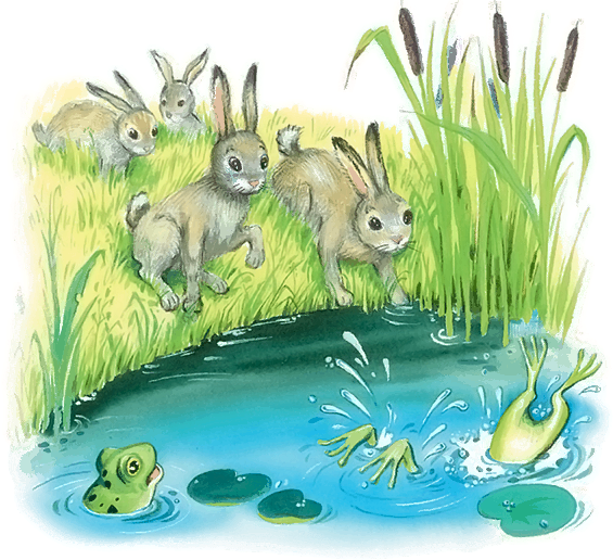 Лягушки услыхали зайцев и забултыхали в воду.