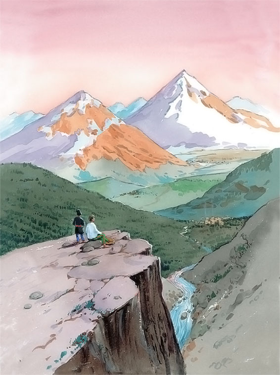 Стало солнышко закатываться. Стали снеговые горы из белых – алые; в чёрных горах потемнело; из лощин пар поднялся, и самая та долина, где крепость наша должна быть, как в огне загорелась от заката. Стал Жилин вглядываться, – маячит что-то в долине, точно дым из труб. И так и думается ему, что это самое – крепость русская.
