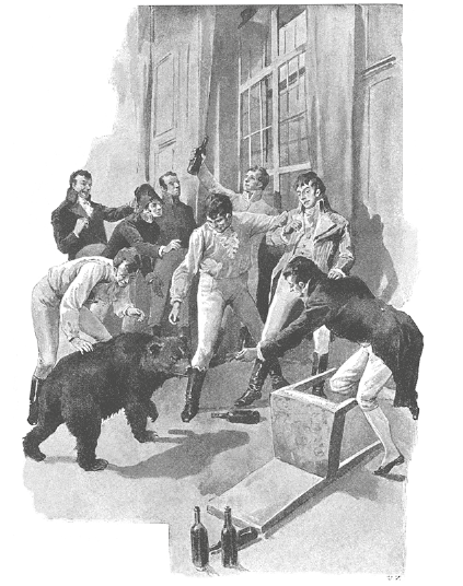 Игра и ужин уже кончились, но гости еще не разъезжались. Пьер скинул плащ и вошел в первую комнату, где стояли остатки ужина и один лакей, думая, что его никто не видит, допивал тайком недопитые стаканы. Из третьей комнаты слышалась возня, хохот, крики знакомых голосов и рев медведя. Человек восемь молодых людей толпились озабоченно около открытого окна. Трое возились с молодым медведем, которого один таскал на цепи, пугая им другого.
