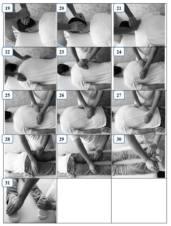 На фото видно, что сеанс начинается с положений рук на голове, а затем руки двигаются ниже. При этом есть один важный момент. Дойдя спереди до ног, вы делаете позицию рук, как показано на фото №18, а затем перемещаетесь вверх, перекладывая руки по телу, чтобы сохранить контакт с телом человека. Потом просите исцеляемого перевернуться на живот, и продолжаете сеанс по задней части головы, тела и ног. При этом ступни ног – это последняя позиция, которая заземляет человека, и делается она только один раз в самом конце сеанса.