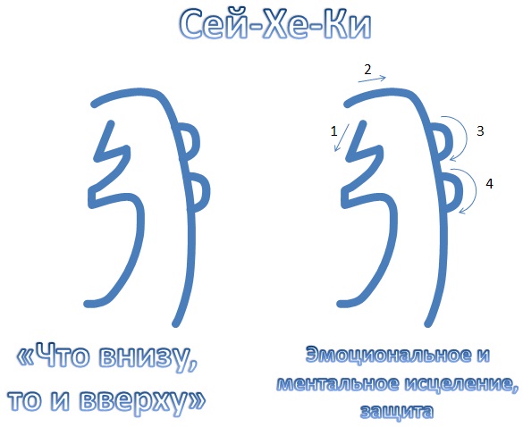 Перевод символа Сей-Хе-Ки: «Что внизу, то и вверху». Второй символ – это самый рабочий символ. Именно с его помощью и происходит исцеление. Запускаемая с помощью первого символа энергия Рейки, начинает производить эмоциональное исцеление с помощью второго символа. Он помогает очищать все негативные эмоции, которые человек испытывал ранее, и которые могли оставить след в его физическом и эмоциональном телах.