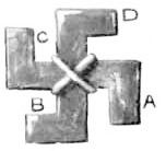 Рис. 5 изображает щит бронзового века, с фоном тускло-красной эмали, и с оружием, направленным влево; в то время как на рис. 6, взятом между ног статуи Будды из Цейлона, оно повернуто вправо. Ее также можно найти среди следов этого Божества, иногда обе формы, использовались для выражения одного и того же. В Китае, знак свастики произносится как Ван, означая огромное количество, множество, великое счастье, долголетие, используются обе формы, но чаще всего то, что повернуто налево.