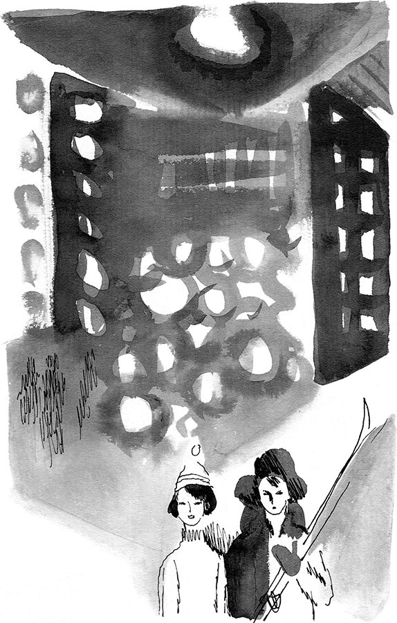 Вика уже не плачет. Борька, хотя у него всё ещё дрожат руки, подбирает свои и Викины лыжи. Они выходят на улицу и идут рядом.