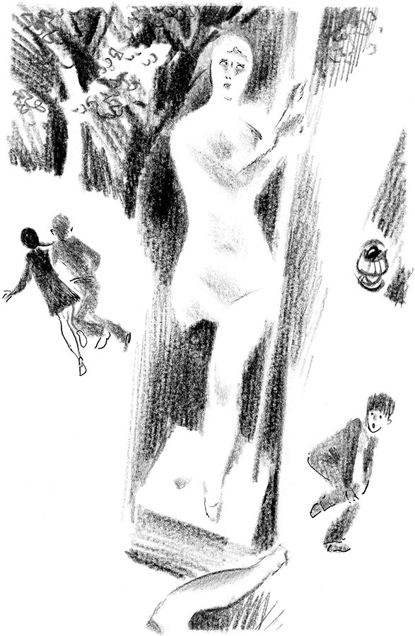 Юрку они нашли в дальнем углу парка. Он стоял, приподнявшись на цыпочки, и тёрся лбом о ногу женщины, стоявшей на постаменте. Женщина, сжимая в руках весло, задумчиво глядела в небо. У неё не было одного уха.