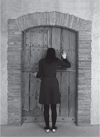 Зрители смотрят в «глазок» деревянной двери, встроенной в кирпичный проём. На фоне пейзажа они видят муляж тела обнажённой женщины, лежащей на зелёной траве со светильником в руке, и слышат шум водопада