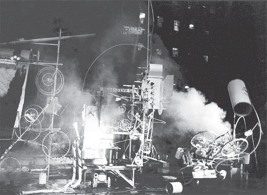 Жан Тэнгли. Оммаж Нью-Йорку. 1960. Ассамбляж из моторов, колёс, труб и разного металлического хлама. Акция с саморазрушающимися машинами была показана в саду Музея современного искусства в Нью-Йорке