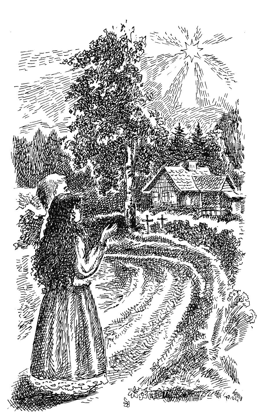 Наконец пришли они раз вечером к одинокому дому. Было это уже на втором году их странствия. Был Троицын день, и пришелся он на конец мая, когда первая весенняя зелень только что начинает распускаться на деревьях. Как только они вошли через калитку во двор, они увидали большую березу с нежной светло-зеленой листвой, сквозь которую в полусумраке вечера ярко светила звездочка. В это время года вечера уже были такие светлые, что эта звездочка была единственная, которую видно было на небосклоне, так как она была самая большая и самая яркая.