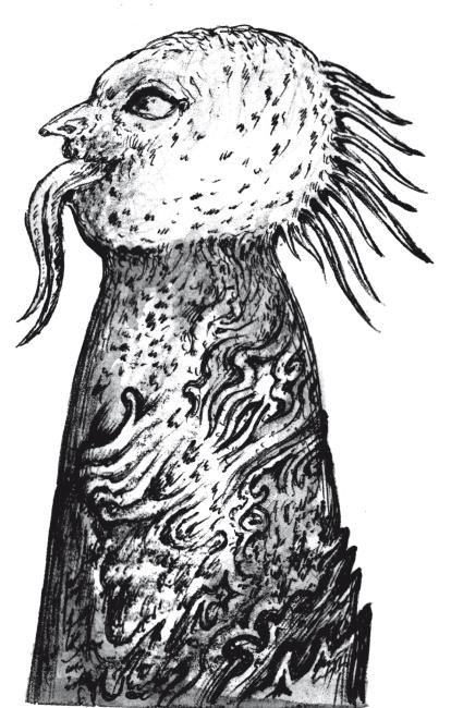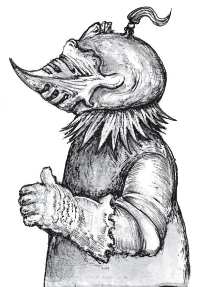 Алхимическая посуда или дома, виднеющиеся из-за городской стены, – понимать можно было двояко, – были на следующем листе, а внизу, в углу, плясала, упираясь кулаком в бедро, полная женщина с головой свиньи. В другой руке у нее был разбитый кувшин.