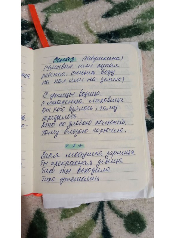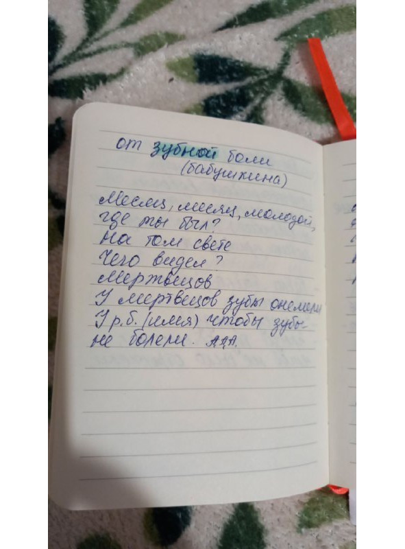 Заря, зарница, Божья помощница, помоги мне Господи, щели заговаривать. Як этому дереву на сём свете не шумети, не мати зелёная, квети так человеку шалы не мати. На Саянской горе стоит хата, в этой хате дядько лебедяко по имени Андрейка железной нугой силистая ярый зуб зомовляя, с буйной головы, с горячей крови шел выбивая. Выговариваю с костей, с мощей, с жил, с нажил, с горячей крови, с желтой кости, с ясных очей.