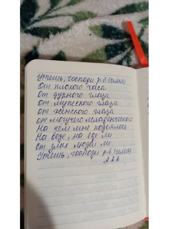Тын, тын возьми свой Утин, на мхи, на болота, на сухое дерево. Там жить, там быть, там красавица. Аселабни ты раба Божьего (имя) дочку (сыночка) на этот час, на этот раз, на эту минутку. Аминь Святому Духу!
