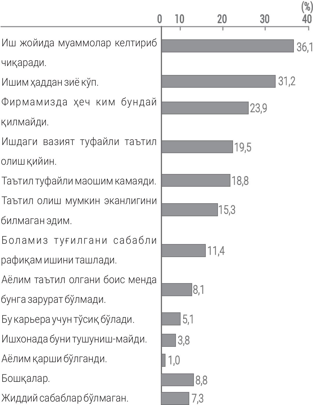 Бор-йўғи 36,1% оталар иш жойларида ортиқча муаммо туғдирмаслик учун таътил олишмайди, 31,2% оталар эса, бундай таътилни олиш истагида бўлсалар ҳам, ҳеч иложини топа олишмайди (2-жадвал) .