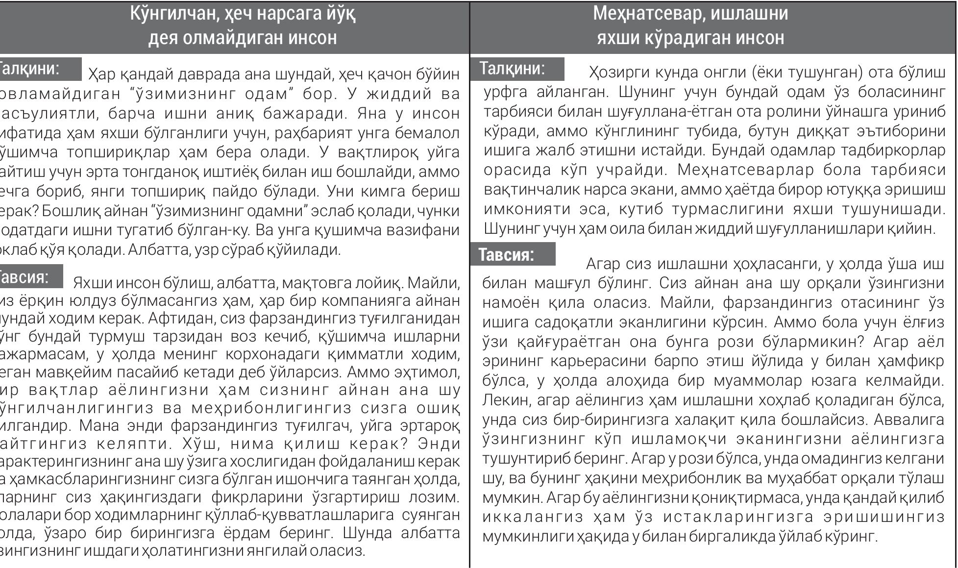 Улар шундоқ ҳам ташвишланаётган бўлса, мен уларга шунчаки: «Оила ишдан муҳим!» ёки «Агар бола тарбияси билан фаол шуғуллансангиз, у ҳолда ўз ҳаётингизда ҳам нимадир ўзгаради», деб айта олмайман. Буни улар менсиз ҳам яхши билишади.