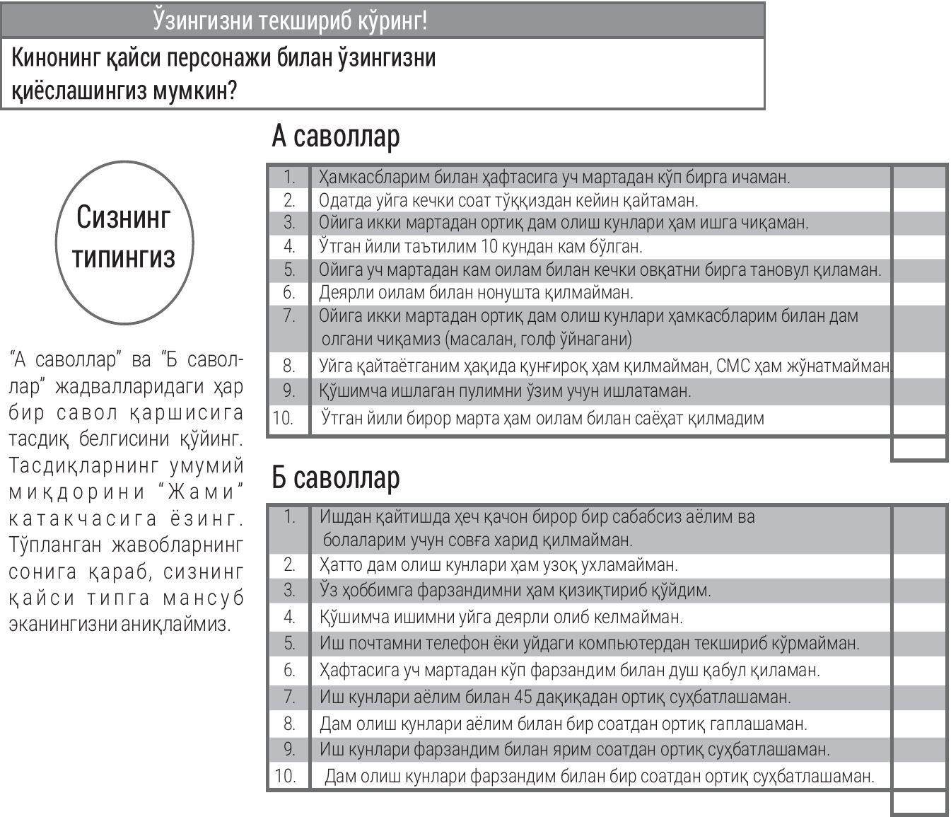 Шусиз ҳам, то охиригача маромига келтирилган иш жадвалини, яна нима билан ҳам тўлдириш мумкин? Ундан кўра, бўш вақтингизни оила билан бирга ўтказишни мазмунан бойитиш афзал эмасми?