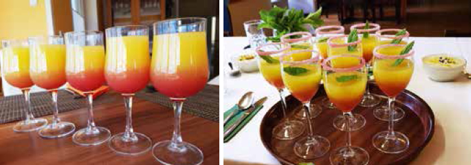 Als Bitter-Aperitif Wermuttee und Orangensaft in ein Glas geben, vorsichtig den Himbeersirup dazu gießen, damit der Farbeffekt erhalten bleibt, mit einem Blatt Minze verfeinern und vor dem Essen genießen. Dies hat eine sehr anregende und verdauungsunterstützende Wirkung.