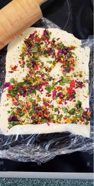 Die kalte Butter zwischen zwei Frischhaltefolien legen und ausrollen. Mit gehackten Kräutern und Blüten (evtl. Kräutersalz) der Saison bestreuen und einrollen. Anschließend kühlstellen und in Scheiben schneiden.