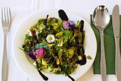 1 Handvoll junge Blätter von Löwenzahn, Giersch, Schafgarbe • 1 Handvoll junge Baumblätter von Birke, Weißdorn, Linde • 1 Handvoll Frühlingblüten, wie Himmelschlüssel, Veilchen, Gänseblümchen • 1 Apfel, kleinwürfelig geschnitten • 1 Orange, kleinwürfelig geschnitten • 1 EL Zitronensaft oder Apfelessig • 1 EL Leinöl • ½ TL Honig • 1 Prise Salz • 1 EL Walnüsse, gehackt