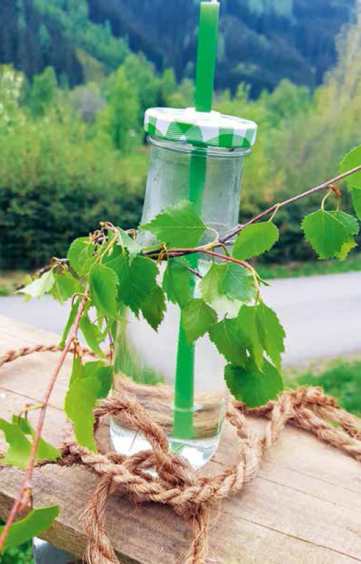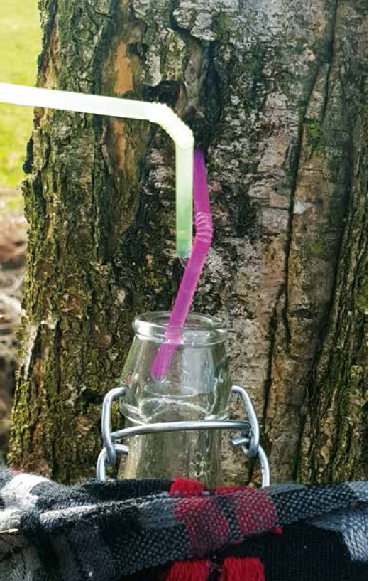 Im Frühjahr, bevor die Birke ihre Blätter austreibt, kann man den Stamm anbohren. Dabei wird ein feines Loch am unteren Teil des Stammes bis unter die Rinde gebohrt und ein Strohhalm hineingesteckt. Ans andere Ende des Strohhalmes wird eine Glasflasche gehängt, dabei immer wieder kontrollieren, ob die Flasche voll ist. Das kann in einer Stunde sein oder in ein bis zwei Tagen, je nachdem, wie viel Wasser der Baum geben kann. Wir bedanken uns und schließen das Loch mit einem feinen Ästchen. Im Kühlschrank aufbewahren und täglich 1–2 Stamperl davon trinken. Der frische Birkensaft kann Schlackenstoffe und angesammelte Gifte aus dem Körper leiten. Weiters ist er blutbildend, entgiftend, entsäuernd, mineralisierend, vitalisierend, entzündungshemmend und abschwellend bei Gicht und Rheuma, hilft bei Knochenabbauprozessen, Gelenksbeschwerden, hat eine klärende, entgiftende Anti-Age-Wirkung für die Haut. Wirkt haarstärkend: Als Haartonikum in die Haarwurzeln einmassieren, aktiviert die Kopfhaut und reduziert so Haarausfall. Als Haarspülung macht Birkenwasser mit etwas Essig ein fülliges glänzendes Haar.
