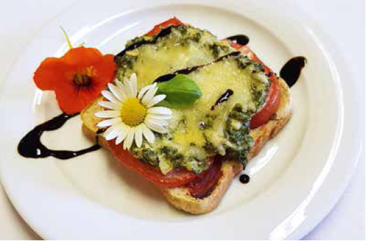 1 Zwiebel • 1 EL ÖL • 1 Handvoll Kräuter (Brennnessel, Giersch, Löwenzahn, Bärenklau) • 4 Stück Toastbrot • 2 Tomaten oder 2 EL Tomatensauce • 2 EL Sauerrahm • 2 EL Käse, gerieben (Bergkäse, Mozzarella, Schafkäse)
