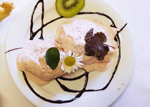 Die Kräuter fein hacken und die Früchte tiefgekühlt dazugeben. In einem guten Mixer oder einer Moulinette (das Gerät muss dafür geeignet sein!) gemeinsam mixen. Die Sahne oder das Joghurt dazugeben und mit Zucker oder Ahornsirup süßen. Nochmals gut durchrühren oder mixen. Bis zum Servieren kühl stellen. Evtl. mit Rosenblüten und Minzeblättern, in Schokolade getunkt, garnieren.