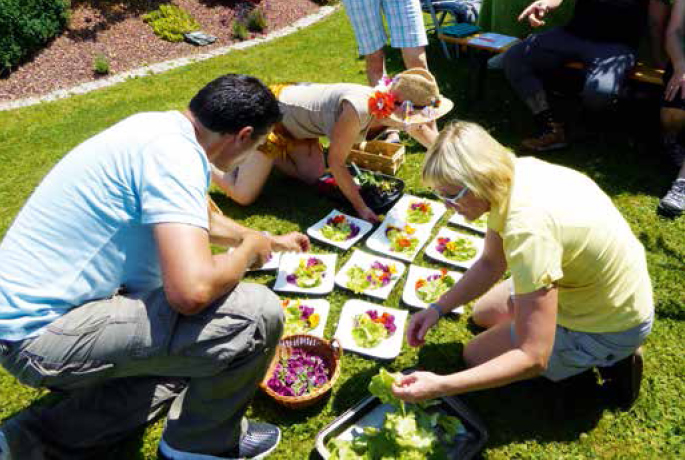 Nun den Salat auf die vorbereiteten Teller anrichten, mit den Blüten dekorieren und die gehackten Nüsse darüberstreuen.