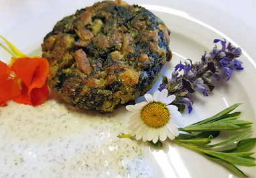 Alle Kräuter, wie Melise, Giersch, Petersilie uvm., kleinhacken und mit den weiteren Zutaten verrühren. Etwas ziehen lassen und zu den Brennnessel-Laibchen dazu servieren.