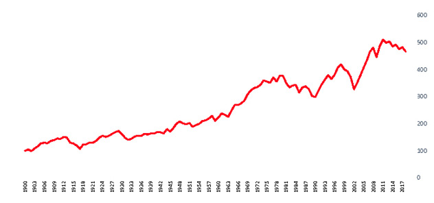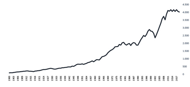 Este Gráfico muestra la evolución del Producto Bruto Interno por habitante de Argentina en valores constantes, desde 1900 hasta 2019. Se observa que el mismo se ha multiplicado por cinco en el lapso considerado.