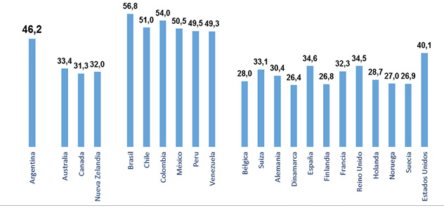 10 La selección de los países a comparar es ciertamente arbitraria. Se ha procurado incluir países que guardan cierta similitud con Argentina en aspectos productivos o en su posicionamiento continental en América Latina, que en algún momento del lapso a considerar fueron también similares en cuanto a su potencial económico y de los cuales los argentinos nos resistimos “emocionalmente” a rezagarnos.