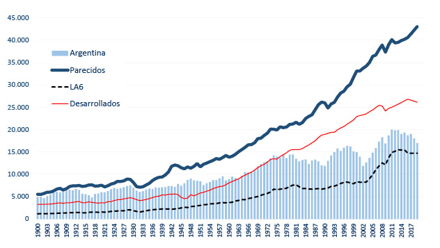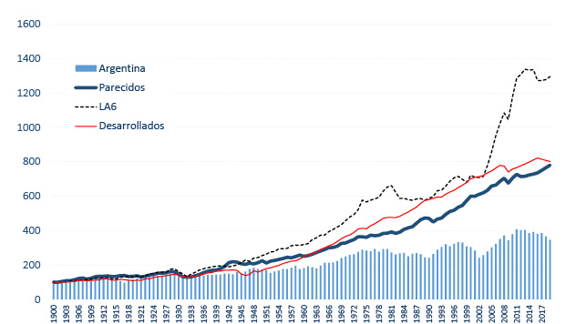 En este segundo análisis las diferencias que se producen y se van acumulando se observan con mayor claridad, pues se unifica el punto de partida y se analiza la evolución posterior a lo largo del tiempo. En este caso la pérdida de terreno de la Argentina respecto de los tres grupos de comparación se hace más evidente ya que partiendo todos de un valor 100 en 1900 el índice para Argentina en 2019 llega a un valor de 380, mientras que para los “parecidos” alcanza un registro 753, para los “desarrollados” asciende a 822 y para los del grupo LA6 alcanza el valor de 1.272, en este último caso con un avance importantísimo en el siglo XXI gracias al vertiginoso crecimiento de precios de los commodities que venden al mundo (mejora observada en parte por la Argentina, pero sólo hasta 2011). Así, partiendo de una misma base inicial, las series se separan significativamente quedando la Argentina notablemente rezagada respecto del resto.