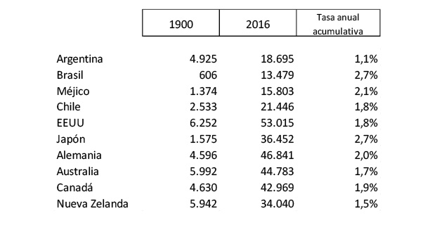 Estos números “gruesos” constituyen una primera evidencia de que en los casi ciento veinte años considerados la Argentina marchó en materia de PBIph a un ritmo más lento que el resto de los países incluidos en la muestra. Si bien la diferencia de valores parece exigua al observar la tasa anual acumulativa8, debe tenerse presente que son valores anuales para el extenso período 1900-2019 y que cuando esa brecha se prolonga durante tanto tiempo las diferencias finales se agigantan.