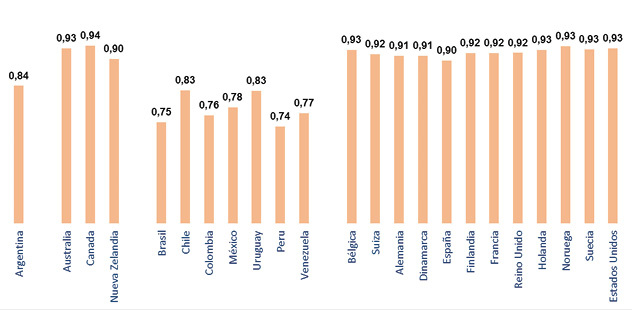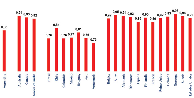 Finalmente, comparando el Índice de Desarrollo Humano (IDH) calculado anualmente por el Programa de Naciones Unidas para el Desarrollo (PNUD) incorporando elementos relativos a las condiciones de vida, educación y salud, se observa también que la Argentina se encuentra estancada17 de acuerdo al Gráfico 9.