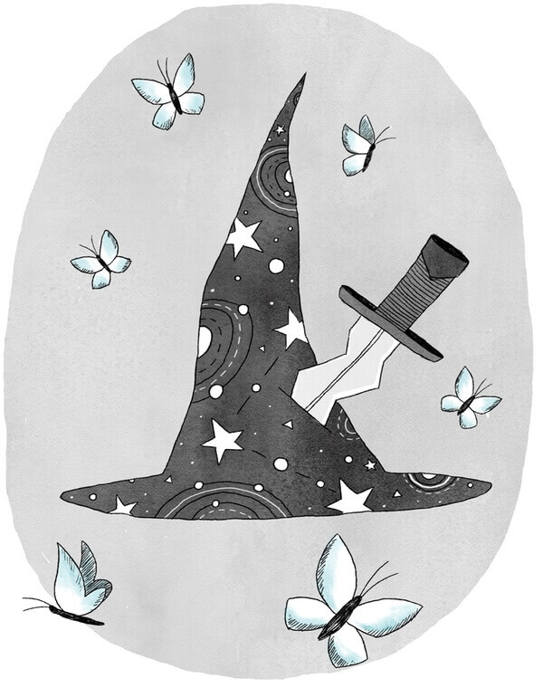 Старец прыгнул – да так проворно, что волшебная шляпа не поспела за его седой головой и на миг повисла в воздухе. Там, где долю мгновенья назад была его спина, мелькнул кривой нож: звездочет и не заметил, как сзади через зубчатую стену перетекла еще одна тень. Король швырнул в нее щит – треск попадания в грудь, и тень полетела обратно за стену.