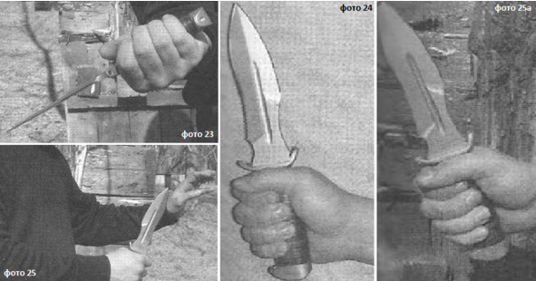 Если посмотреть на направление клинка сбоку, то обычно для каждого из основных хватов ножа можно выделить два основных направления. При хвате ножа клинком в сторону от большого пальца клинок может быть направлен или строго вверх, или слегка вперед (фото 24, 25, 25а).
