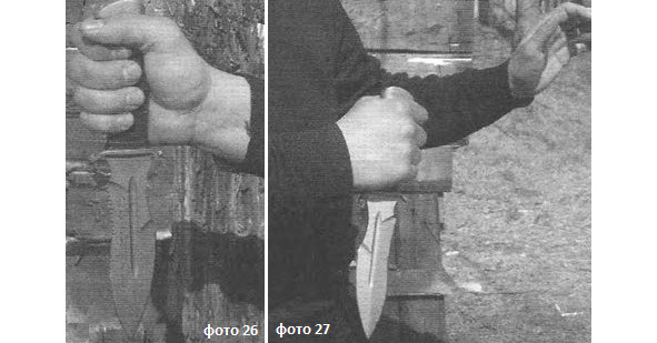 При хвате ножа клинком в сторону от мизинца, клинок может быть направлен строго вниз, или слегка вовнутрь (фото 26, 27).