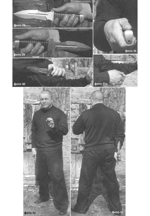 Следует обратить внимание на то, что хват ножа лезвием к себе при его расположении вдоль предплечья с внутренней стороны чаще всего используется при ударе рукояткой ножа вперед, для нанесения колющего удара, в направлении на себя, и для скрытого от противника удержания ножа (фото 31—33).
