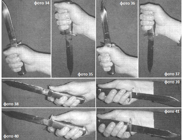 Особое внимание при классификации хватов ножей многими авторами очень часто уделяется особое внимание направлению лезвия ножа. Обычно лезвие может быть направлено к себе или от себя, вверх или вниз. Для боевых ножей «Взмах» и «Катран» это вряд ли существенно, так как оба ножа, подобно кинжалам, эффективно режут при любом направлении лезвия. Для ножей с односторонней заточкой направление лезвия действительно может иметь значение, особенно при использовании техники режущих ударов (фото 34—41).