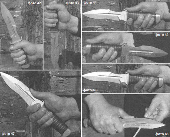 Однако следует в обязательном порядке учитывать, что каждый нож по-своему индивидуален и имеет свои особенности при выборе варианта его хвата. Например, современный боевой нож предоставляет возможности использовать максимально различные варианты его хвата в зависимости от ситуации и действий, которые необходимо выполнять этим ножом – см. варианты хвата современного боевого ножа (фото 42—48).