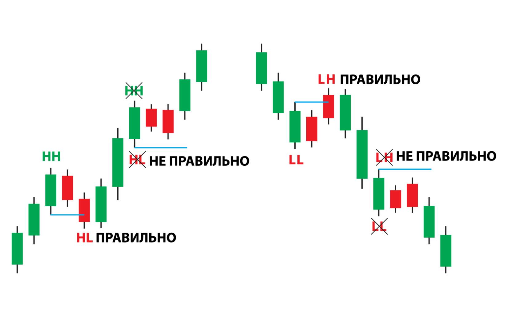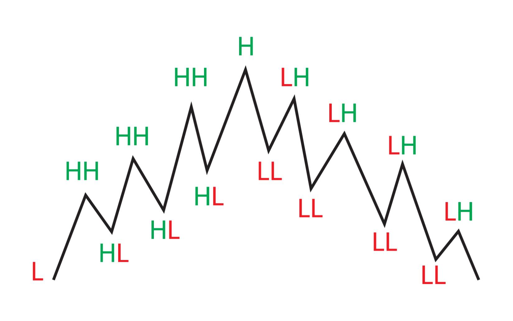 В техническом анализе используются понятия, высокий максимум (HH), низкий максимум (HL), высокий минимум (LH) и низкий минимум (LL). Для описания структуры ценового движения. Эти термины помогают трейдерам определить тренд и возможные развороты на рынке.