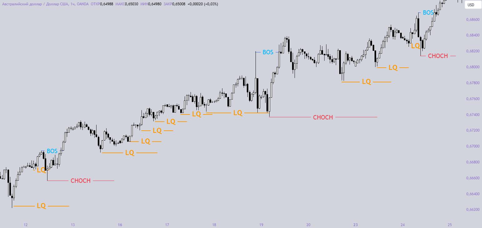 В примерах я пометил все HL как ликвидность, это для того, чтобы вы понимали что это такое. Когда вы сами начнете чертить график, ликвидность можно передвигать. Нам главное, чтобы цена сняла ближайшую ликвидность, для будущего построения BOS. Также передвигаем и CHoCH, важен только последний, он будет сигналом, что тренд изменился.