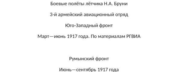 Примечание: Всего за период с 16 мая по 15 июня 1917 года Бруни выполнил 6 боевых полётов. Общая их продолжительность пока не известна, так как в журнале эти данные не отображались.