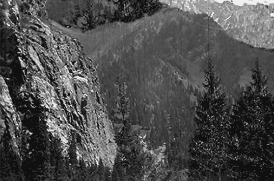 Неожиданное происшествие взбодрило, и дальнейшая дорога не казалась трудной. Оставив в стороне небольшой, скорее всего егерский дом, вышли на тропу, поднимающуюся к вершине. Из земли выступали коренья деревьев, и создавалось впечатление, ступенек необычной лестницы. Незаметно достигли седловины перевала и зачарованно остановились, поражённые незабываемым виденьем. Петляющая тропинка круто опускалась вниз, к бурной горной речке. На противоположной стороне ущелья, сразу за изумительной красоты поляной, высилась высокая скала.