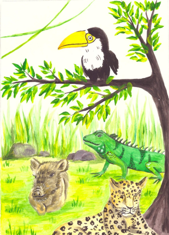 Много стран на свет есть,И чудесных мест не счесть.Ты на глобус погляди-ка.Видишь, это Коста-Рика.Здесь прекрасная природа,Всегда чудная погода.И открою я секрет,Что зимы здесь вовсе нет.Здесь зверь любой, любая птицаНе грустит, а веселится.А чего же им грустить?Есть что кушать, есть что пить.Вон на ветке кто сидит?Симпатичный он на вид.Клюв огромный. Ого-го-го.Туканчиком зовут его.Непоседа эта птица.Никак на месте не сидится.С друзьями надо поболтатьИли просто полетать.А вот, проснувшись очень рано,Пришла в гости игуана.Ее очень любят тут,Игуаночкой зовут.Спит на травке Ягуарчик,Рядом с ним лежит Кабанчик.Только вот одна забота:Черепашки нету что-то.Вдалеке, смотри-ка, вотНа себе свой дом несет.Для нее дождь – ерунда.Не промокнет никогда.А купаться любит очень.Она морская, между прочим.Всех друзей теперь мы знаем,Значит, сказку начинаем.