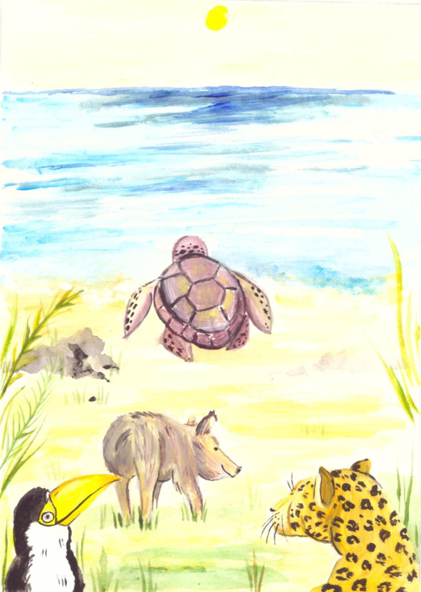 Игуана: «Что тянуть?Отправляемся мы в путь.А ты, Туканчик, не зевай,Наш маршрут определяй».Все собрались – и вперед.Приключений много ждет.Вдаль тропинка убегает.Весело зверье шагает.Подошли к горе крутой,Над ней белеет дым густой.Вулкан же это. Стало быть,К нему опасно подходить.Стоят и думают друзья:«Подниматься вверх нельзя.Значит, гору обойдем.Дорогу к морю мы найдем».Черепашка на спинеШепчет: «Так охота мнеЭто море увидать.Ведь я морская, так сказать.Хоть родилась на берегу,Но плавать хорошо могу».Ягуарчик ей в ответ:– А у меня желанья нет.Купаться в море? Ерунда.Лежать на травке – это да.Тебе, конечно, подсоблю.А сам я воду не люблю.Кабанчик топает: «Хрю-хрю.И я об этом говорю.Пловец я вовсе никакой,Ведь я кабанчик не морской».Игуаночка им вслед:– Любви к прекрасному в вас нет.Необязательно купаться.Морем надо любоваться.Моря разные бывают,Карибским наше называют.Океанами странаС двух сторон окружена.Вот такие разговоры.Позади остались горы.Сияет моря красота,И Черепашкина мечтаИсполнилась. Она застыла,С Ягуара соскочила,К воде мчится со всех ног.Никто поверить бы не смог.Так с черепахами бывает?Такую скорость развивает,А тут такие вот дела:С разбега в воду – поплыла.Смотрит с завистью народ,Ловко как она плывет.Ягуарчик подошел:«Возле моря хорошо».Так подумалось ему,Но купаться ни к чему.Кабанчик постоял в воде.– Плавать страшно, быть беде.