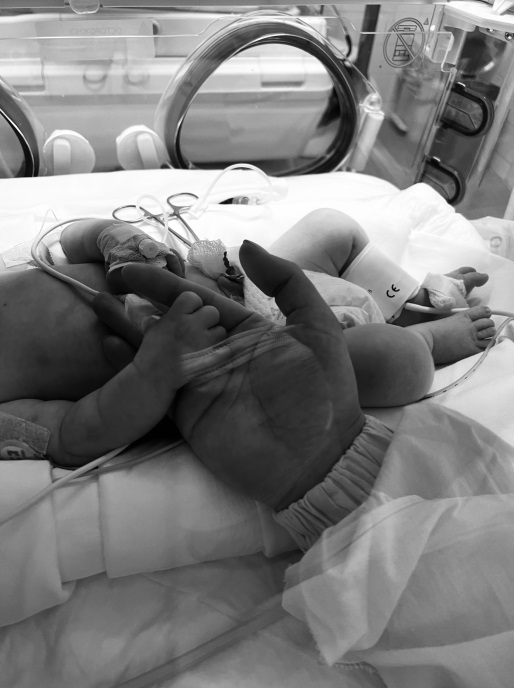 Держу своего новорожденного сына за ручку в детской реанимации.