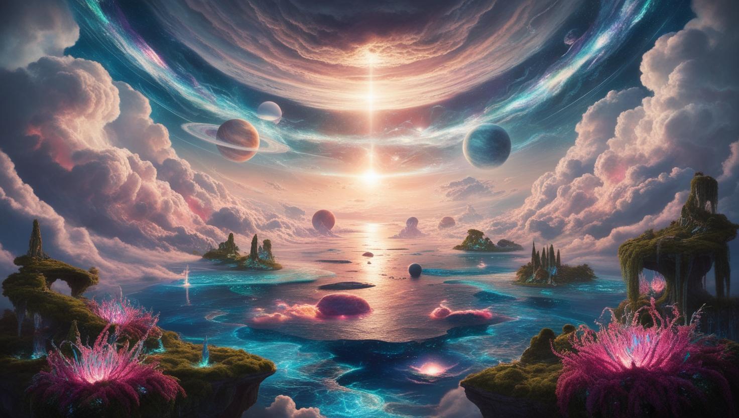 Но боги не были привязаны к одному месту. Они могли находиться где угодно: в лесах, над океанами, на вершинах летающих гор или внутри энергетических сфер. Земля Альфа была наполнена удивительными пейзажами, созданными самими богами. Парящие горы, которые медленно двигались по воздуху, соединяясь в сложные узоры. Леса Света, где деревья сияли мягким голубым светом, а каждая капля росы содержала энергию жизни. Живые океаны, которые могли менять цвет, звучать как музыка и общаться с богами. Кристальные пустыни, наполненные песком, который был не минералом, а концентрированной энергией. Эти места были не просто фоном, а живыми пространствами, взаимодействующими с богами. Боги могли существовать без пищи, но для удовольствия они создавали еду из чистой энергии. Плоды Древа Жизни – наполненные сознанием, они давали не просто питание, а знания.