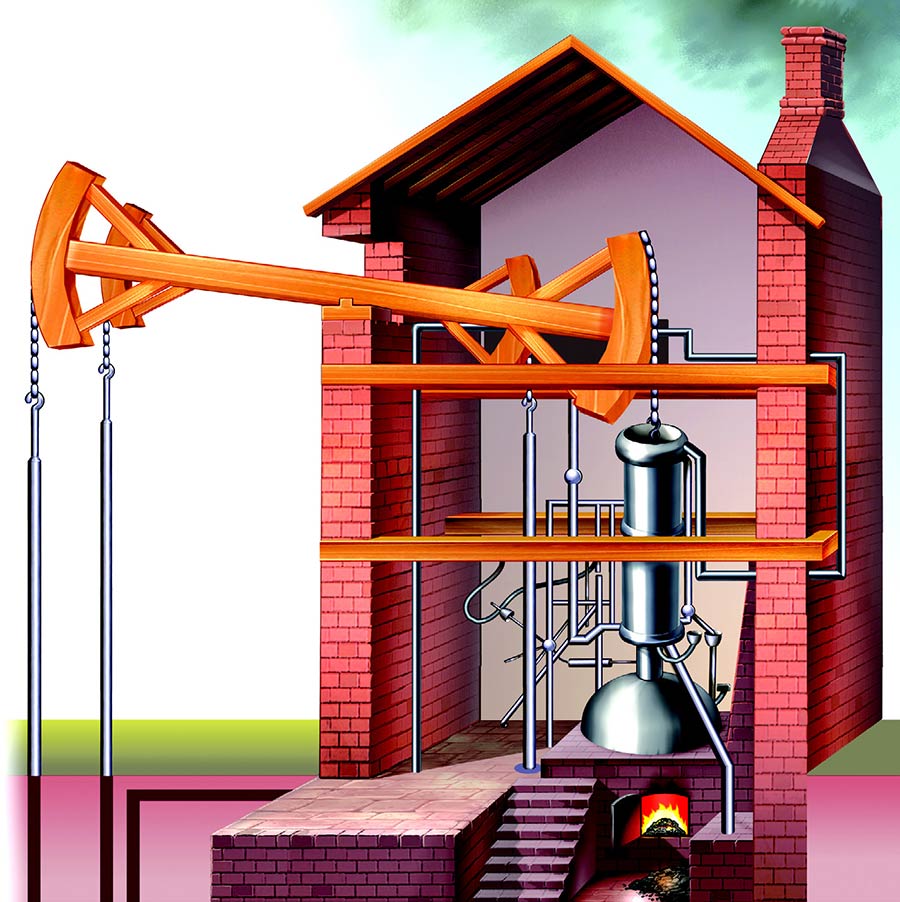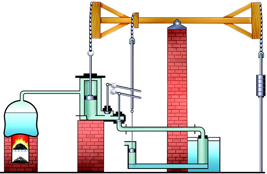 Она была так называемого атмосферного типа и работала следующим образом. Сначала в цилиндр из котла подавался пар. Поршень шел вверх. Затем в цилиндр впрыскивалась холодная вода. Пар сгущался, в цилиндре образовывалась пустота, и атмосферное давление (вот откуда название машины – «атмосферная») гнало поршень вниз, приводя в движение водяной насос.